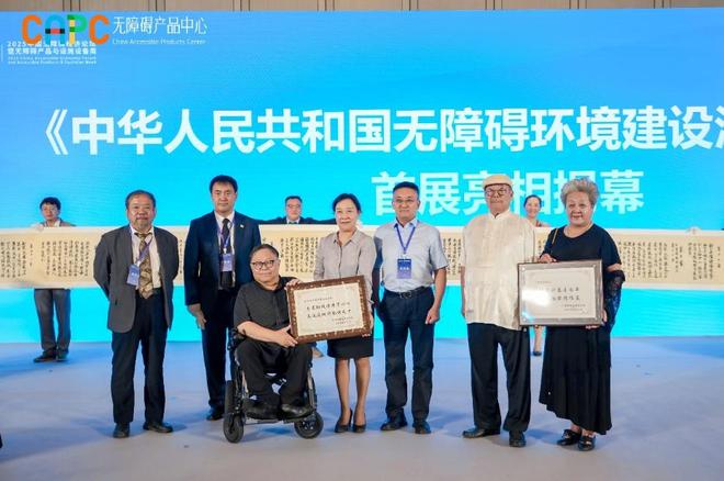 本次论坛得到了北京市残疾人联合会、湖南省残疾人联合会、成都市残疾人联合会等单位的大力支持。论坛期间,与会领导嘉宾共同参观了无障碍产品与设施设备周展示。国家无障碍环境展示馆、北京市残疾人服务示范中心、上海交通大学、浙江大学等单位,以及成都天佑晶创科技有限公司、广州小蒜智能科技有限公司、帝欧家居集团股份有限公司等企业携近百件展品参展,充分体现了我国无障碍环境建设法的立法理念与实践。展示现场陈列着一幅由中国著名书画艺术家都本基创作的长度约为60.28米的《中华人民共和国无障碍环境建设法》手书长卷,全国人大常委会委员、中国助残志愿者协会会长吕世明与中国轻工企业投资发展协会名誉理事长、无障碍产品中心主任李国都等领导为都本基颁授感谢牌匾,感谢他通过中国传统艺术的表达方式让无障碍理念更加深入人心,为无障碍工作的普及与发展做出贡献。