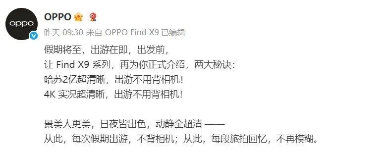 OPPO Find X9系列产品负责人周意保此前发文确认,新机全系支持哈苏8K超清照片,可实现全焦段直出。
