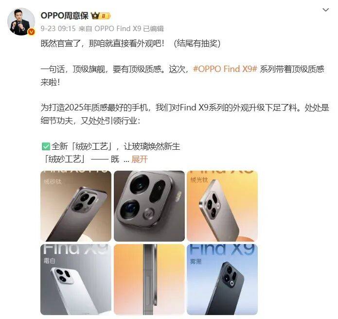 据OPPO Find系列产品负责人周意保此前的预热显示,全新的「绒砂工艺」,既能让玻璃焕发出高级内敛的绒感金属光泽,又能在玻璃上打造出绒般细腻的亲肤感,让OPPO Find X9系列机身呈现出独一无二的「绒砂质感」。