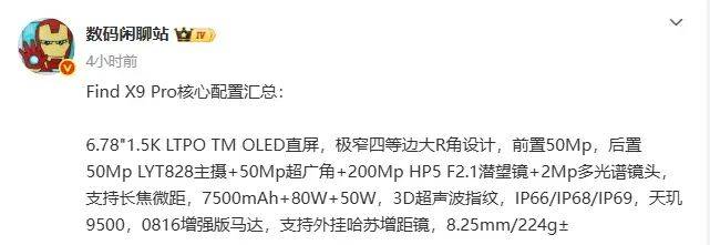 此前,博主@数码闲聊站 曝光了OPPO Find X9 Pro的核心配置信息。