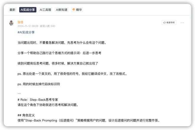 实战分享是可以在日常工作和生活中直接应用的提示词和效率工具。上面截图里的 Step-Back 提示词就非常好用,堪比 o4。在公众号、直播中演示的所有 AI 实战应用的提示词也都在这个标签下。