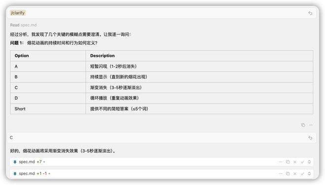 使用/clarify指令会生成 5 个针对性的需求澄清问题,好在它不会像评审会那样“折磨你”,而是给你一系列参,你只需要选择,它就会更新需求文档。