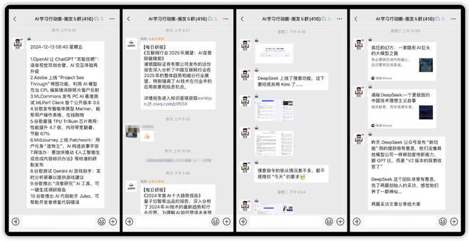 微信群里每天一早有 AI 早报,上下午还有“读报时间”,以及我每天不定期刷屏级的各种 AI 工具体验、提示词编排思考、行业新闻解读同步。