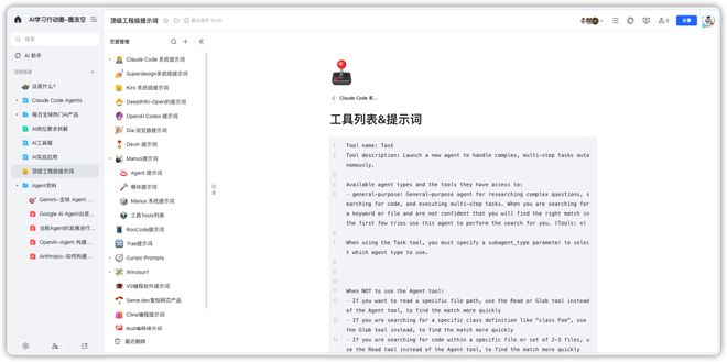 当前包括:Claude code、Cursor、Manus等顶级产品的系统提示词和工具列表,各种深度的 Agent 白皮书和实践指南